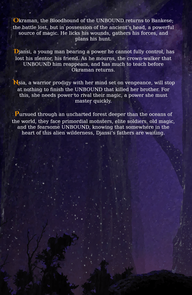 Pursued through the Epoya, an ancient, uncharted forest, Djansi & Nsia face primordial monsters, elite soldiers, forgotten magic, and the fearsome UNBOUND, knowing that somewhere, lost in the heart of this alien wilderness, Djansi’s fathers are waiting.